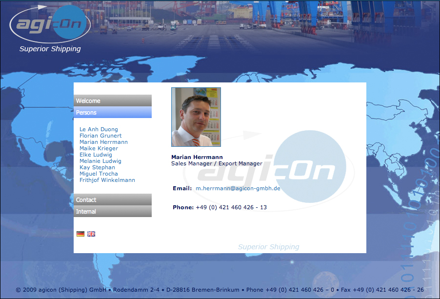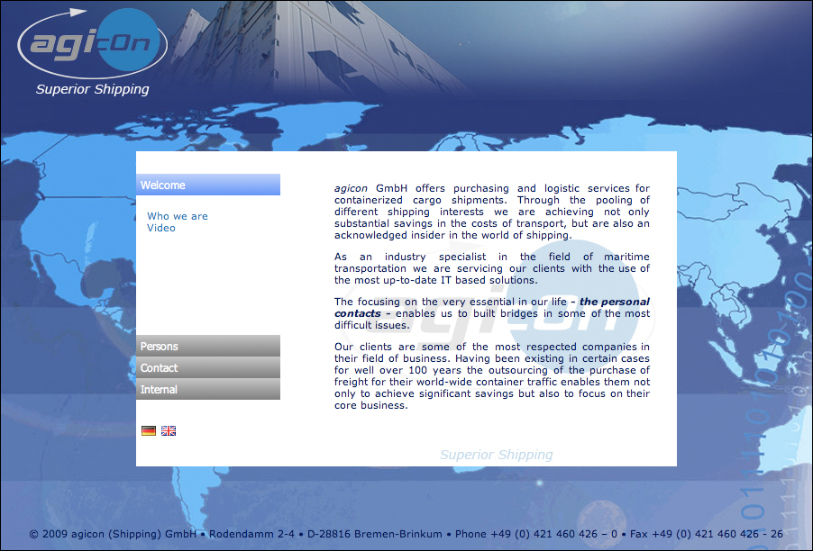 Die agicon (shipping) GmbH ist ein ambitioniertes Unternehmen im Bereich der weltweiten Containerverschiffung. Mit einem breiten Spektrum an Leistungen stehen sie ihren Kunden 24 Stunden am Tag an sieben Tagen der Woche zur Verfügung.
